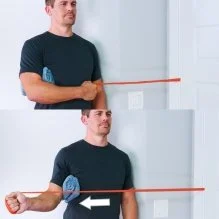 4. Shoulder external rotation: With the elbow flexed to 90 degrees, keep your elbow adducted at your side (can use a towel or small ball). Using either bands or cable machine, keeping your elbow at your side bring your fist away from your chest, so your fist is in plane to your truck.